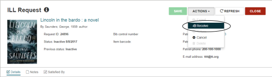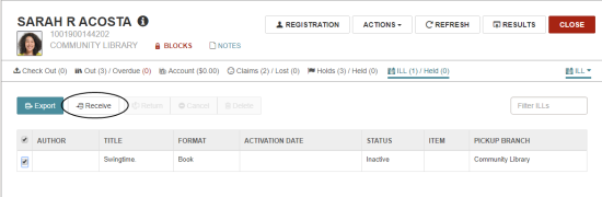 - Click the check box next to the ILL request you want to receive, and click Receive.