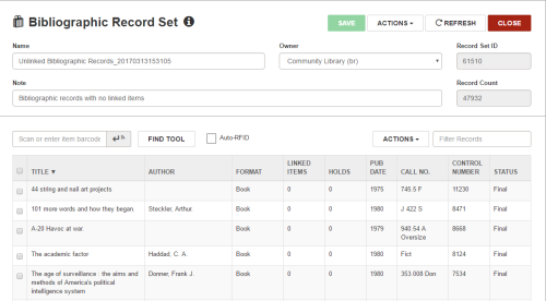 - If you created a bibliographic record set, the following note appears on the Bibliographic Record Set workform: Bibliographic records with no linked items.