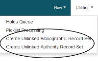 - Select Utilities | Create Unlinked Bibliographic Record Set or Create Unlinked Authority Record Set.