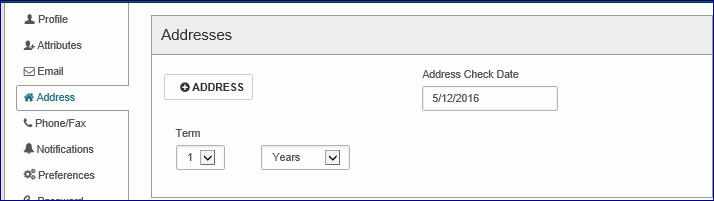 - Click/tap in the Address Check Date box, and select a date when the patron’s address should be checked. Or, under Term select a number and select Years or Months. The address check date changes when you select a term.