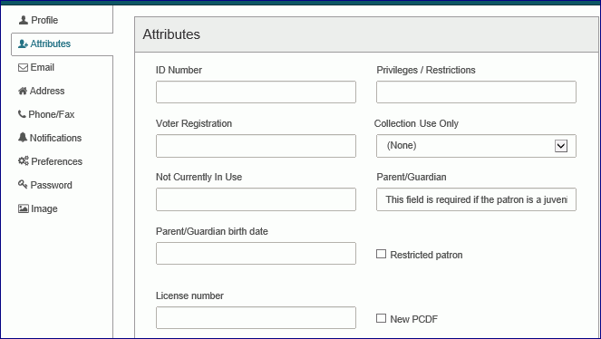 - Select Attributes in the navigation bar to go to the Attributes section, and enter additional information in the user-defined and custom data fields that your library has set up. For more information on user-defined and patron custom data fields, see the Polaris staff-client online Help.