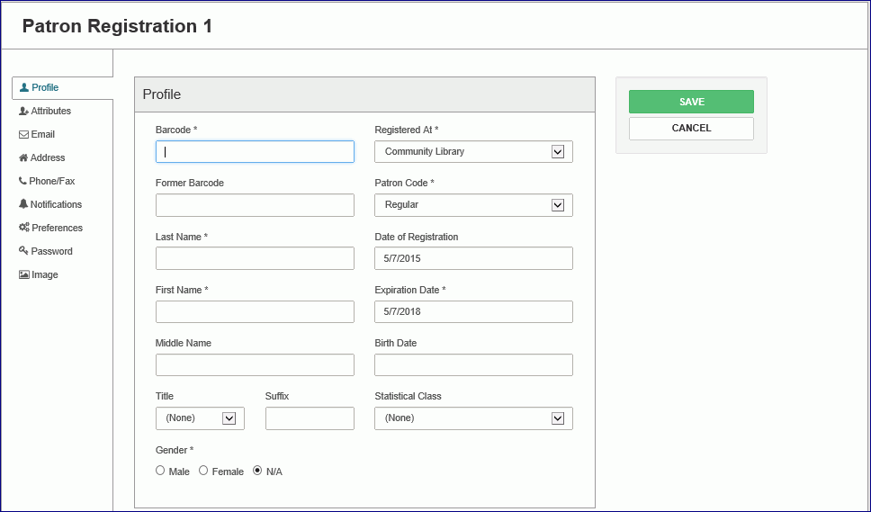 - Select SAVE to save the new patron record.