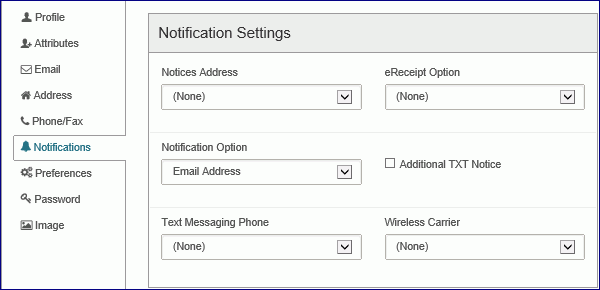 - Select the address type to which notices will be sent. The addresses must be entered in the Addresses section to appear in this list. For example, if you specified a home address, it is listed as Home.
