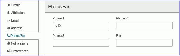 - Select Phone/Fax in the navigation bar and enter the patron's phone number(s) and fax number (if applicable).