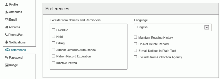 - In the Preferences section, select the check boxes that indicate the patron's preferences: