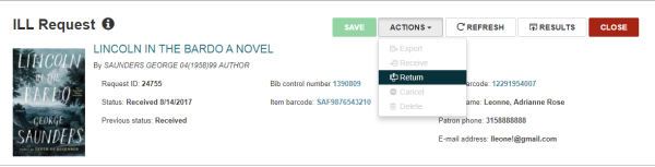 This Return option in the ACTIONS menu is enabled only when the ILL request has a status of Received and the linked item record has a status of In or In-transit.