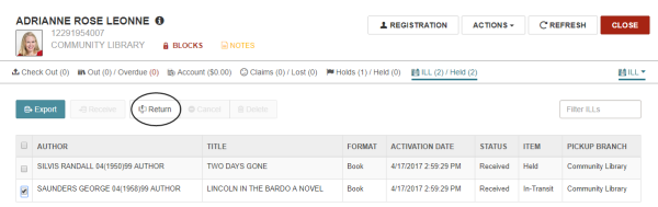 You can return an ILL item from the ILL Request workform or the ILL view of the Patron Record workform. To return an ILL item, the ILL request must have a status of Received and the linked item must have a status of In or In-Transit.