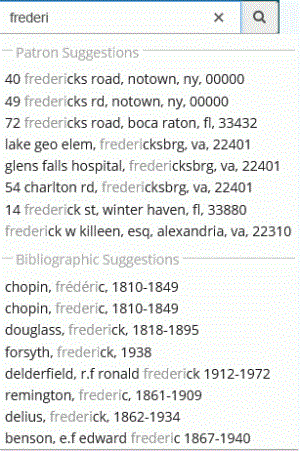 - Start typing in a search box. If matches are found, automatic suggestions for patron and bibliographic records are displayed.