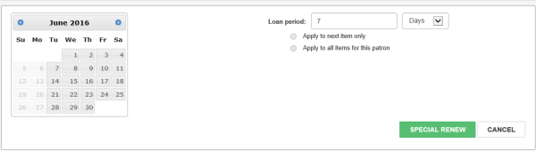 - (Optional) If you want the loan period to apply to other items for this patron, select Apply to next item only or Apply to all items for this patron.