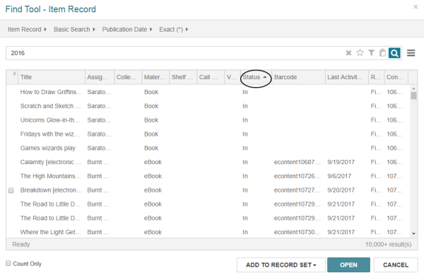 To sort search results in the Leap Find Tool, select a column heading. For example, select the Status column heading in item search results to sort the list by the circulation status.