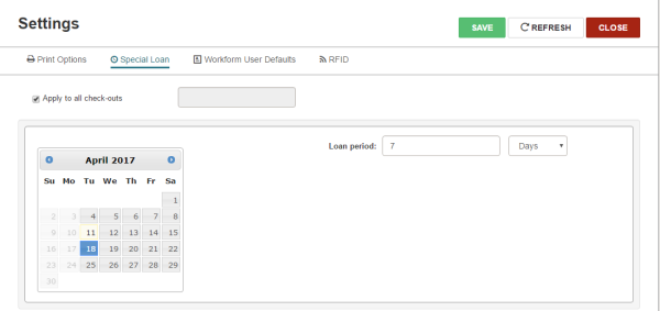 To set a special loan period to apply to all check-outs for the logged-in session: