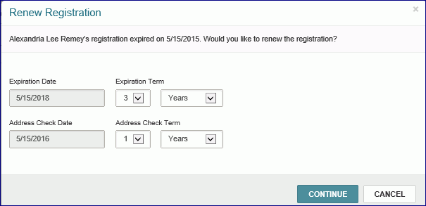 - To renew the patron’s registration, click RENEW to open the Renew Registration box.