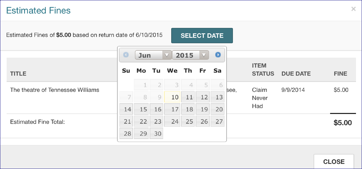 - To see fines based on a different return date click/tap the SELECT DATE button and select another date. The estimated fine amount changes.