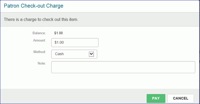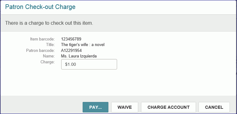 - CHARGE ACCOUNT - the charge is added to the patron's account, and the item is checked out.